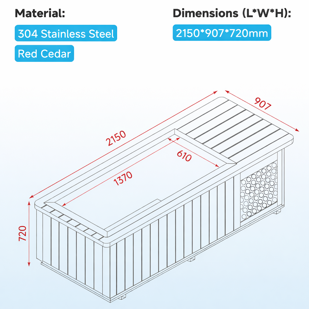 Experience elite cold therapy without compromise. The Cedar Luxe is a premium lay-flat cold plunge tub crafted from natural Red Cedar and food-grade 304 stainless steel — engineered for outdoor use, designed to turn any backyard, deck, or patio into a world-class recovery station.